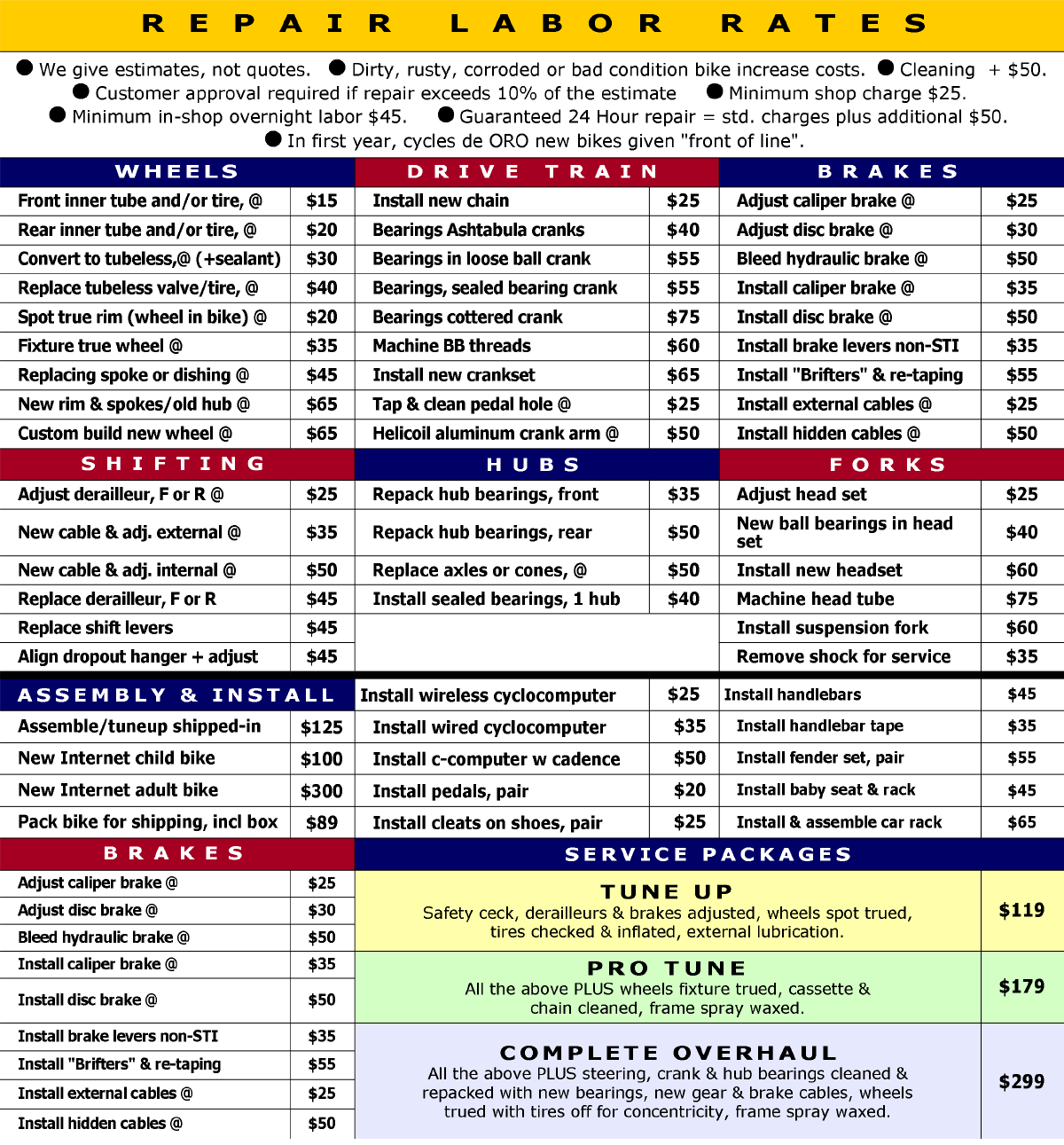 Repair Labor Chart Use as a general guide. Subject to change without notice. Not applicable to bicycles in distress or unusual models, including tandems, e-assist, non-standard models.